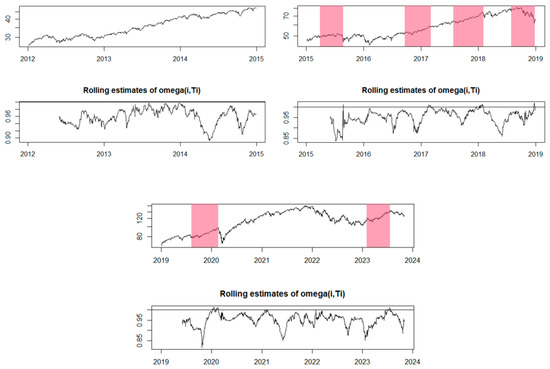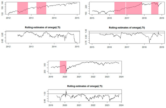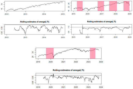In Equation (3), the essential parameters are estimated, where denotes the financial asset’s price at time , and represents the error term. The expression indicates a scenario in which the price of the financial asset follows a random walk pattern. This means that the price does not exhibit a directional trend but undergoes random variations over time. In such a situation, the parameter has limited influence on the price evolution since it is mostly determined by random or unsystematic factors.