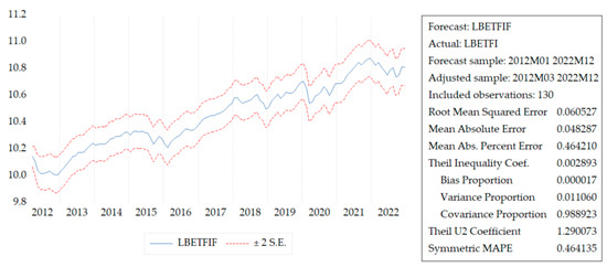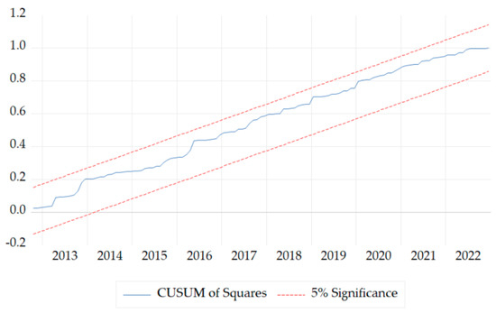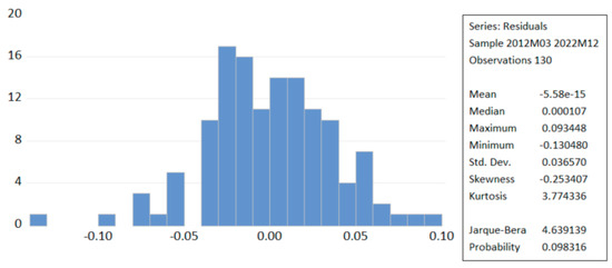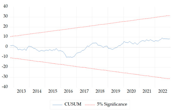 - Verification of cointegration and development of the Error Correction Model (ECM). The ARDL model was improved by incorporating the bounds test, which examines whether a combination of I(0) and I(1) variables exhibits a long-term relationship. The structure of the ARDL bounds test is delineated by Equation (8):where constitute the short-term terms and represent the long-term terms. According to Pesaran et al. (2001), if the calculated F-value is statistically significant, the subsequent step involves constructing an Error Correction Model (ECM) to analyze both long-term and short-term dynamics. The significance of the F-value is assessed in comparison to critical values established by (Pesaran et al. 2001). A dynamic ECM can be derived through a simple linear transformation of an ARDL model. This ECM integrates short-term dynamics with long-run equilibrium, preserving crucial long-term information. By doing so, it addresses issues like spurious relationships that may arise when dealing with non-stationary time series (Shrestha and Bhatta 2018). The lagged variables and from Equation (8) are replaced with the Error Correction Term (ECT) in Equation (9). The ECM is structured as follows, as outlined in Equation (9):