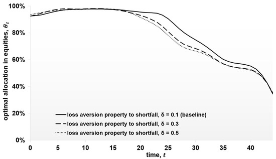 The model applied in this paper is heavily influenced by the loss-aversion ratio. For example, if the loss-aversion ratio increases sharply, the sponsor mainly focuses on minimizing the expected underfunding. In contrast, a strategy maximizing the expected overfunding is preferred if the loss-aversion ratio is close to 0. Here, we compare the baseline case with two cases: .