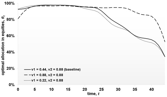 Figure 3 shows the optimal asset allocations in equity for numerous curvature parameters. When the parameter increases from to , the sponsor will focus on generating overfunding. Accordingly, they would keep holding a relatively higher equity portion over the control period. One peculiarity is the relatively lower equity weighting at the earlier stage. It could be interpreted that a higher requires relatively lower equity investment at the beginning stage to provide a build-up of assets relatively sufficient for aggressive investments.