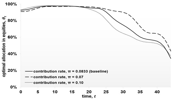Figure 4 depicts the optimal equity portions for contribution rates, showing that the optimal equity portion declines as the contribution rate increases and is relatively higher at an earlier stage regardless of contribution levels. Overall, a higher contribution rate leads to a more conservative investment, despite a relatively higher chance of accumulating sufficient buffer assets for risk taking.