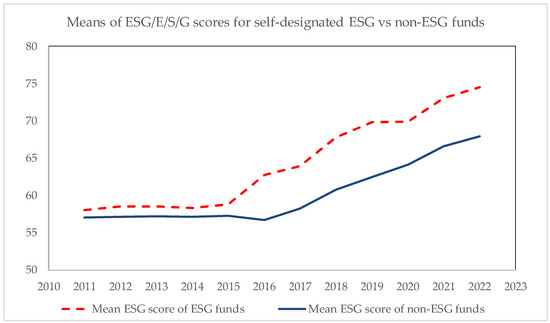 Time variation in cross-sectional, annual means of actual Refinitiv ESG scores for self-designated ESG mutual funds vs. non-ESG funds.