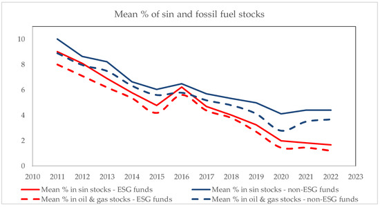 Table 3 shows that, as one would expect, self-defined ESG mutual funds (mutual equity funds that carry the words “ESG”, “Sustainable”, “Sustainability”, “Green”, or “Social” in their fund names) apply stronger exclusionary criteria than non-ESG funds. Looking at median portfolio shares, for instance, ESG funds hold only 4.1% in sin stocks (vs. 6% in the case of non-ESG funds), almost entirely (4%) in oil and gas firms (vs. 5.7% for non-ESG funds), and avoid tobacco and gambling firms altogether (while non-ESG funds carry negligible but positive median holdings). All the differences in portfolio shares across ESG and non-ESG funds are statistically significant, irrespective of whether standard parametric t-tests are applied to the spreads in sample means or nonparametric Kruskal–Wallis tests are applied to spreads in sample medians.
