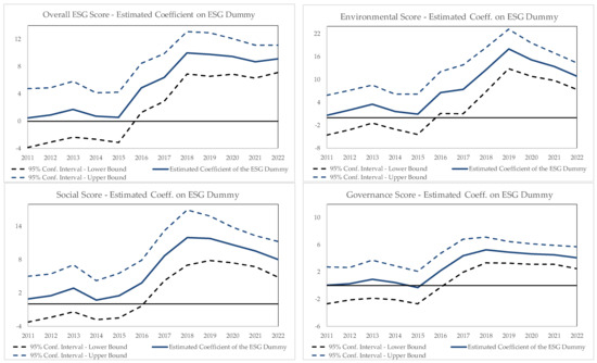Figure 3 shows the evolution over time of the estimated coefficient associated with the ESG dummy with reference to the four alternative dependent variables constructed on the basis of the objective ESG scores of the stocks held by the mutual funds. To allow an assessment of estimation accuracy achieved by OLS in each of the annual cross-sections, we also plot 95% confidence intervals built with heteroskedasticity-robust standard errors. Visibly, after a temporary “lull” in 2013–2014, all coefficients grow and, in fact, turn statistically significant after 2017, exactly in correspondence to the break-date used in Table 7. Arguably, this corresponds to the introduction of the Morningstar Sustainable Fund Rating methodology. However, at least with reference to the estimated coefficients for the Environmental and Social sub-scores, such a trend is reversed after 2020, after reaching a peak in 2019. This suggests that, possibly because of the pandemic shock or of an increasing (and justified) media focus on environmental damage and climate change, the mutual funds that had not explicitly declared themselves to be sustainability-driven gradually started to do so. As a result, the spread in the impact on the ESG scores of the self-attributed ESG label would have started a slow decline, which would be interesting to check when data for 2023 and later annual vintages become available. As already noted with reference to Table 4, the weakest of the spread impact coefficient concerns the Governance score, probably as a reflection of the fact that since the late 1990s, the academic literature has abundantly warned investors and money managers of the crucial role played by the governance quality of listed firms; see, for instance PRI Association (2022).