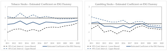 Table 8 reports on similar summaries of annual cross-sectional regressions when the variable to explain is the portfolio share of each fund allocated to sin stocks, either as a whole or after classifying them in the same three categories as in Table 6. Also in this case, as the awareness of greenwashing has surged with regard to investors and the general public over the years, we should expect a negative (partial) correlation between the percentage share invested in sin stocks and the ESG dummy to become increasingly negative, which makes for a negative and declining OLS estimate of the related coefficient. Indeed, similar to Table 7, the value of the OLS estimate of the coefficients associated with the ESG dummy become increasingly inconsistent with the extensive occurrence of greenwashing as time elapses. In this case, the coefficients become increasingly negative (thus indicating the self-labelled ESG funds allocate a lower share to sin stocks), while the corresponding p-values also tend to decline when we transition from the 2011–2016 sample to 2017–2022. For instance, the dummy coefficient estimated to explain the share in sin stocks as a whole declines from −1.51 in the first period of the sample to −2.69 in the last part (these are averages over annual estimates over the two sub-samples). Notably, this occurs as the proportion of sin stocks held by the mutual fund industry as a whole drastically declines, as discussed in Section 2.3. This last remark, of course, matters in relative terms. For instance, the (average) dummy coefficient of −1.51 implies that over 2011–2016, the ESG nature of a mutual fund led it to reduce its share in sin stocks by 17.7% (=100 × (−1.51%/8.54%)) vs. non-ESG funds; because the coefficient declines to −2.69 over 2017–2022, this means that the ESG designation has recently induced a reduction in the share in sin stocks by a massive 60.2% (=100 × (−2.69%/4.47%)) vs. non-ESG funds. With the exception of the holdings of tobacco stocks, the same trend applies to all sub-categories of “sin” covered by Table 8.