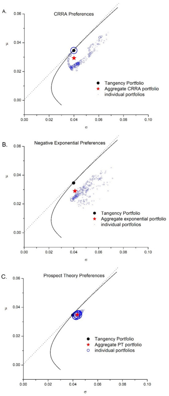 Do the deviations from the tangency portfolio depend systematically on the preference class? Figure 4 shows investors’ equity portfolios by preference class, as well as the aggregate portfolio for each class. In all cases, there are deviations of the individual portfolios from the tangency portfolio, but these tend to cancel out, and the aggregate portfolio of all investors in a given preference class (depicted by a star) is rather close to the tangency portfolio. It is interesting to note that prospect theory preferences yield the smallest deviations from the tangency portfolio.