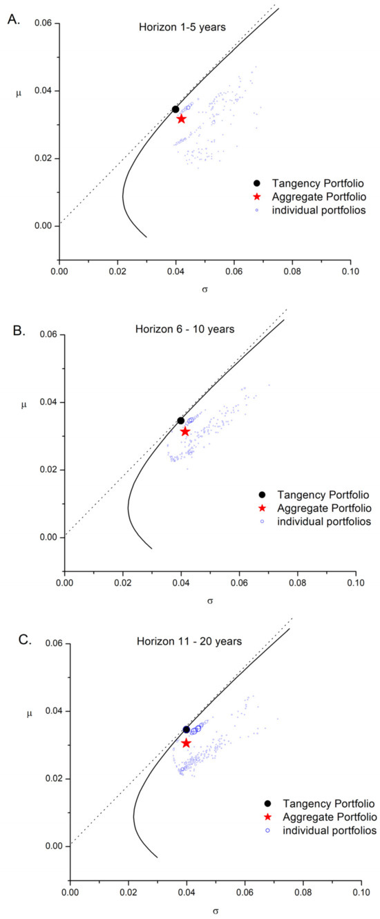Figure 5 shows the results by the length of the horizon. We somewhat arbitrarily categorized horizons as short (1–5 years, Panel A), intermediate (6–10 years, Panel B), and long (11–20 years, Panel C). The star denotes the aggregate portfolio of all investors in each horizon category. For each category, we find that the aggregate portfolio is close to the tangency portfolio. In fact, the aggregate portfolios are even closer to the tangency portfolio compared with the case of aggregation across preference class (Figure 4). This may suggest that portfolio deviations among investors with similar horizons but different preference classes (Figure 5) tend to cancel each other more effectively than deviations among investors with the same preference class but different investment horizons (Figure 4).