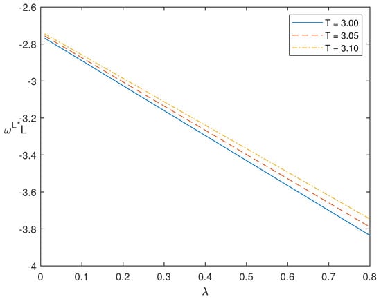 When the mortality rate is high, the longevity risk is usually low. Likewise, might be low because the sponsor may not need a lot of longevity bonds to hedge longevity risk. From another aspect, when the mortality rate is high, the price of longevity bond is low, thus might be low, too. To test this point of view, Figure 3 demonstrates the effect of mortality rate on optimal investment strategy . When the mortality rate becomes larger, the investment amount becomes smaller. Figure 3 also shows that with the same , becomes larger with a longer T. A rational explanation is that the DB pension scheme faces higher risks in the long run, so investment amount in the risky bond (in a short position) becomes smaller in order to reduce risk, which is more clear in Figure 4.