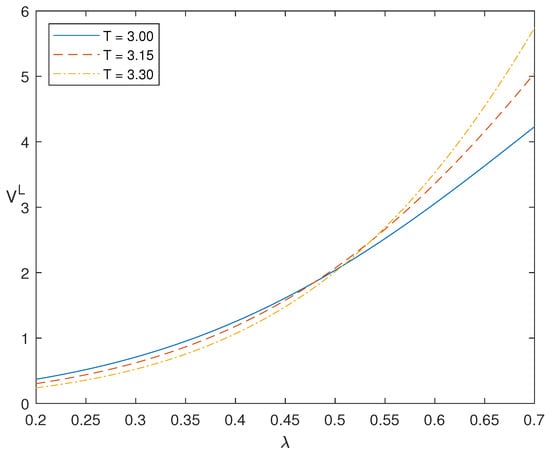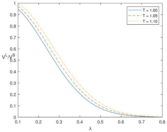 In addition, if longevity risk is reduced by the longevity bond, we may have a lower solvency risk in the market with the longevity bond than that with a normal zero-coupon bond. and denote the value function in Section 3 (with investment in the longevity bond) and Section 4 (with investment in the zero-coupon bond), respectively. To test this, Figure 6 demonstrates the performance of with different values. The ratio is lower than 1 with from to , implying the solvency risk in Section 3 is lower than that in Section 4.