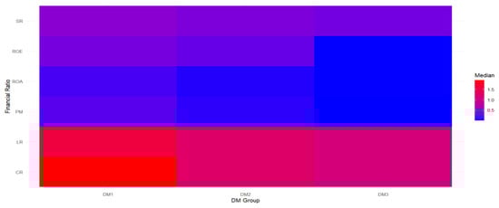 Median heatmaps for financial ratios for DM1, DM2, and DM3.