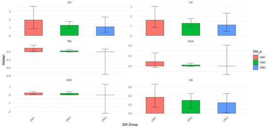 In the next step of our analysis, we utilized a robust statistical approach called bootstrapped medians alongside confidence intervals (CIs) to delve further into our research findings. This method allowed us to address key challenges associated with uncertainty and variability in the data, making our conclusions more robust and reliable. In Figure 2, we use bars to represent the bootstrapped medians and error bars to show the confidence intervals for each group (DM1, DM2, and DM3) and financial ratio. Each bar represents the median value of the bootstrapped samples for a particular group and financial ratio, and the error bars indicate the range within which we are 95% confident the true median lies.