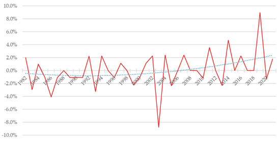 This type of model projects a smooth series. Given and the risk exposures , we compute the annual global mortality rate in France, . When looking at annual variations in this mortality rate from 1982 to 2022 (see Figure 1), we see a rather high degree of volatility. On this figure, the red line is the annual variation of mortality, whereas the blue line is a quadratic fit of this annual variation.