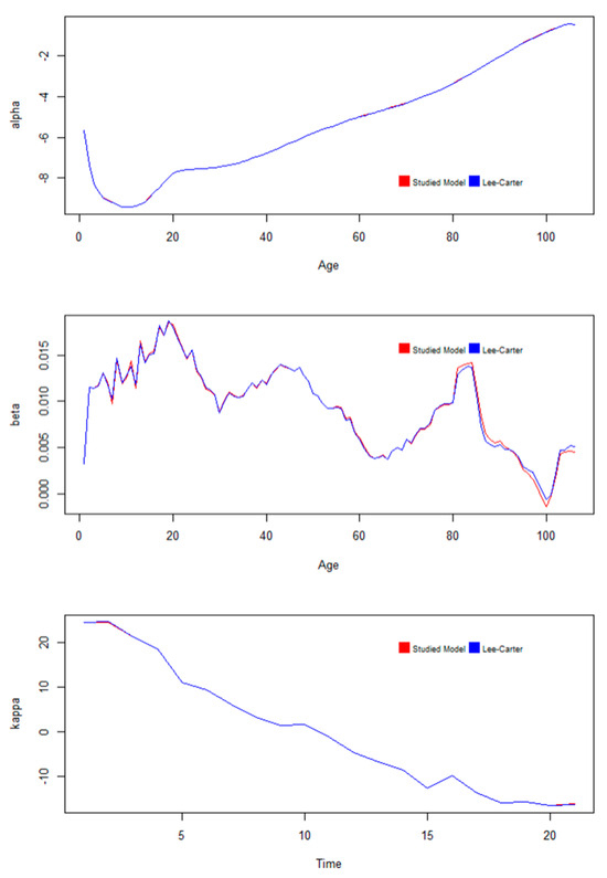 As shown in the following figure (Figure 2), this leads to coefficients that are very close to those of the referenced Lee–Carter model: