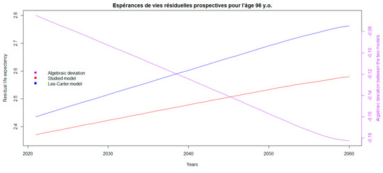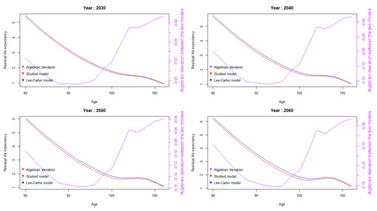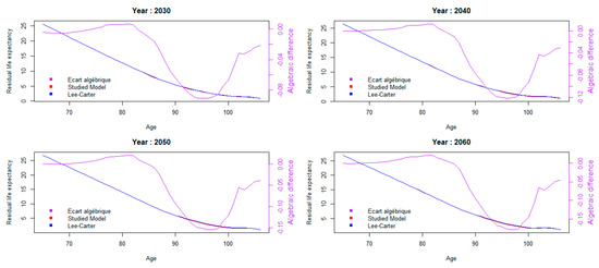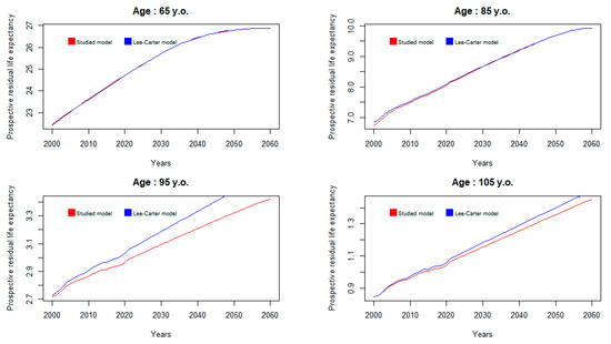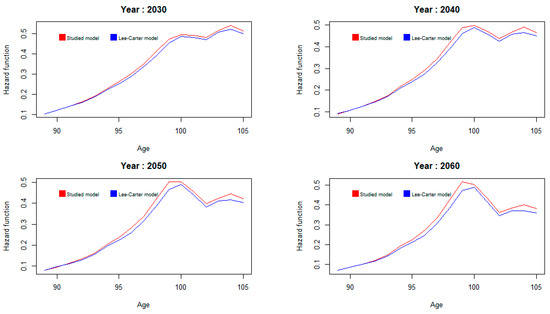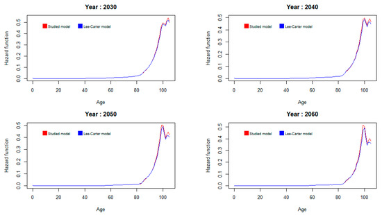 Overall, the mortality model studied tends to predict higher mortality forces than the referenced Lee–Carter model at older ages, and the gap increases over time.