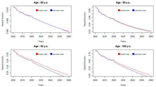 We now compare the mortality forces of the two models over the entire prospective analysis period, for a few selected ages. This comparison is performed in Figure 5: