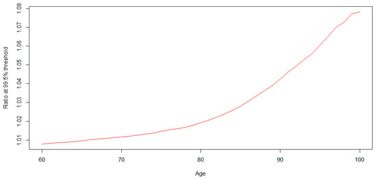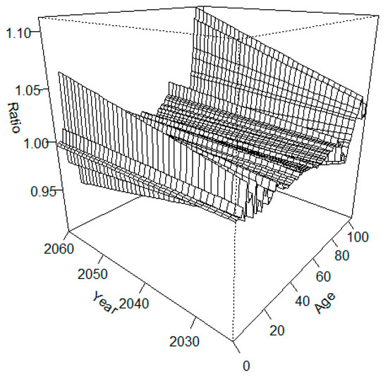 with , the mortality force derived from the referenced Lee–Carter model and model. This ratio is shown in the following figure (Figure 6):