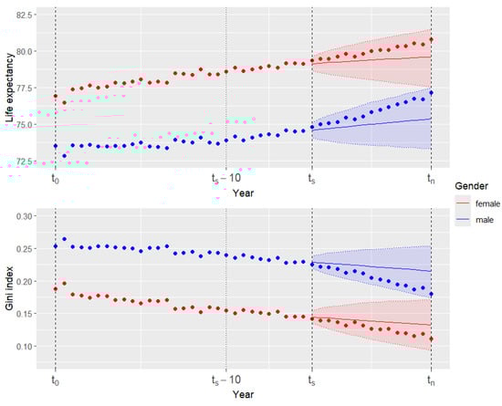 - Using the results of the simulation at point 2.4 as parameters, we resample by bootstrapping from the truncated life expectancy and Gini index trajectories obtained in step 2.3, and we average them using Formula (5) obtaining the forecasted truncated life expectancy and Gini index for all the model-averaging approaches. Similarly, we take the 5th and 95th percentile to build the 90% confidence forecasting intervals for the two metrics. See Figure 2 for an example of forecasted life expectancy and Gini index using the model-averaging approach with equal weights.