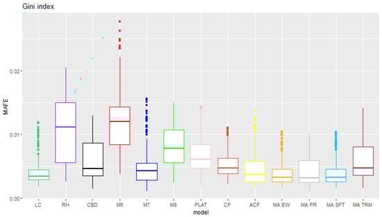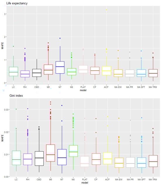 Observing Figure 3, we can generally say that the best results, in terms of MAFE, are given by the model-averaging approaches based on equal and proportional weights and on the softmax function. They all present a median MAFE lower than 0.4 and 0.006, respectively, for life expectancy and the Gini index. The RH model is the third-best model (after model-averaging approaches with equal weights and with weights based on the softmax function) for life expectancy (but with weak performance for the Gini index), while the PLAT model is the best for the Gini index (but has weak performance for life expectancy). The model-averaging approach based on trimming has good overall performance as well. Indeed, it is overcome in terms of median MAFE only by the RH model for life expectancy and the PLAT model for the Gini index. Among the other models, good results are given by the CBD model regarding life expectancy and by the CF model for the Gini index. The worst results here are found in the M7 model for life expectancy and the M6 and M8 models for the Gini index. Other models, such as LC and ACF, do not show remarkable results.