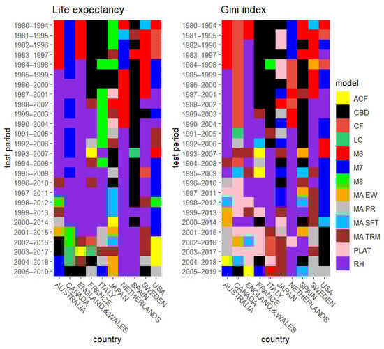 To conclude, in Table 6, Table 7, Table 8 and Table 9 and Figure 5 and Figure 6, we notice that, compared with the rolling test period case, there is less variability in the models’ performance by training period as the test period remains fixed. A similar remark can be made with respect to the results by life expectancy and the Gini index. Instead, regarding the results by country, we observe how the performance variability remains, with many individual models performing well in some countries and badly in others. In contrast, the model-averaging approaches, except for the one based on trimming that is slightly weaker, show good results in all the countries considered.