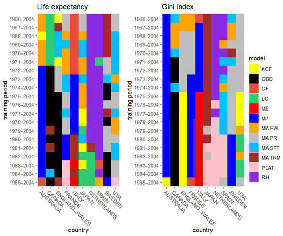 Figure 4 shows the model with the lowest MAFE by country and period. The RH model has the highest number of best performances for both life expectancy and the Gini index (34% and 26%),5 followed by the CBD model (17% and 17%). It is interesting to notice how here the M7 model is the third-best model for life expectancy, despite it being the worst one in terms of median MAFE, and the M6 model is the third-best for the Gini index, despite being the second-worst one in terms of median MAFE. Focusing on the model-averaging approaches, it can be noted that they are seldom the best ones. Among them, the trimming averaging approach has the highest proportion of winning cases (7% and 8%). These results, even if they appear to contradict those in Figure 3, are easily explained. Indeed, model-averaging approaches have solid performance (ranking in the top five positions in terms of lowest MAFE) across all countries, periods, and metrics. On the contrary, individual models that are the best for specific combinations of countries and periods, such as M7 for life expectancy and M6 for the Gini index, are overall among the worst, as shown in Figure 3. Consequently, the advantage of model averaging is striking, in particular when several countries must be considered and models must be updated on different training periods.
