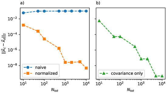 Euclidean norm of the difference vector between optimal relative portfolio weights for the continuous () and discrete optimization case (). The risk-aversion parameter is set to , but different choices of give similar results. The investment universe comprises BMW (ISIN DE0005190003), Deutsche Post (ISIN DE0005552004), Deutsche Telekom (ISIN DE0005557508) and Infineon (ISIN DE0006231004). Data were taken from the period between 1 January 2010 and 1 January 2021. Lines are guides for the eye. (a) Difference between continuous solution and naive discrete approach (circles), as well as the difference between continuous and normalized discrete solutions (squares). Obviously, the naive approach does not converge to the continuous solution, even for very large portfolios. The normalized discrete approach converges to the well-known continuous solution for large portfolios. The remaining differences in portfolio composition are purely due to the discreteness. (b) Difference between continuous and naive discrete solutions for the modified utility function , which only includes the covariance term. It is clearly visible that both the continuous and discrete approaches converge to the same minimum variance portfolio for this modified utility function . Also here, the remaining differences in portfolio composition are purely due to the discreteness.