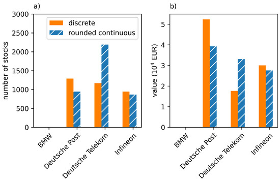 Best portfolio compositions for a budget of B = EUR 100,000 and risk-aversion parameter of . The discrete solution is obtained by minimizing the utility function in Equation (12) under the constraints of Equation (13). We use . The continuous results were obtained by multiplying the relative allocation by the available budget and rounding to integer stocks via Equation (14), which resulted in . The investment universe comprises BMW (ISIN DE0005190003), Deutsche Post (ISIN DE0005552004), Deutsche Telekom (ISIN DE0005557508) and Infineon (ISIN DE0006231004). Data were taken from the period between 1 January 2010 and 1 January 2021. (a) Portfolio composition in terms of number of stocks. (b) Portfolio composition in terms of Euro value.