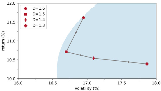 We now perform calculations with the following stock universe reported in order from highest to lowest ESG score: Deutsche Telekom (ISIN DE0005557508), SAP (ISIN DE0007164600), Intesa Sanpaolo (ISIN IT0000072618) and EssilorLuxottica (ISIN FR0000121667). The portfolio optimization problem from Equations (18) and (19) was again solved on a D-Wave quantum annealer for different values of the ESG constraint D. The ESG data were provided by ISS ESG. The grading system is on a scale from 4 to 1, where a higher number indicates a better ESG performance. We use a budget of B = EUR 100,000 and a risk-aversion parameter of . The result in volatility–return space is shown in Figure 5. We first set and obtained a solution with . Hence, we conclude that the actual maximum reachable ESG distance within the given investment universe is . We gradually decreased D from there until the solution visibly departed from the efficient frontier. The latter was again calculated by sampling random portfolio compositions. At a certain point, stronger constraints on produce portfolios that move farther away from the efficient frontier. This finding is consistent with the study by Cesarone et al. (2022).