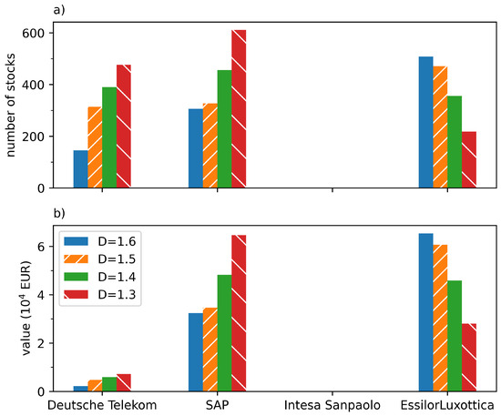We also analyzed the portfolio composition for different values of D. The results are shown in Figure 6. We found that decreasing the distance D from the best possible portfolio in ESG terms gradually increases the weight of stocks with better ESG scores compared to stocks with worse ESG scores, both in terms of the relative composition and budget allocation. Stocks of Intesa Sanpaolo are not part of the optimal portfolios due to their relatively unfavorable returns (not driven by ESG scores). We had to vary somewhat as a function of D so that the full budget can be allocated. As can be seen from Figure 6, allocation to Deutsche Telekom increases with decreasing D. Since stocks of Deutsche Telekom have a much lower price per stock than SAP and EssilorLuxottica, a higher number of stocks has to be allocated, which requires a larger . The resulting budget allocations are summarized in Table 1.