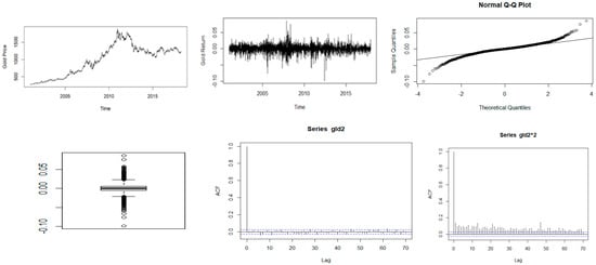 Descriptive plots: Top-left panel—Time series plot of the daily closing price; Top-middle panel—Time series plot of the daily returns; Top-right panel—QQ plot of the daily returns; Bottom-left panel—Box plot of the returns; Bottom-middle panel—ACF plot of the returns; Bottom-right panel—ACF of the squared returns for gold.