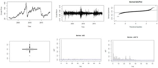 Descriptive plots: Top-left panel—Time series plot of the daily closing price; Top-middle panel—Time series plot of the daily returns; Top-right panel—QQ plot of the daily returns; Bottom-left panel—Box plot of the returns; Bottom-middle panel—ACF plot of the returns; Bottom-right panel—ACF of the squared returns for crude oil.