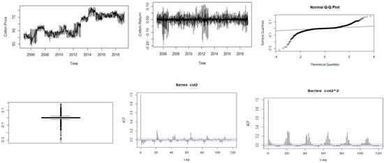 Descriptive plots: Top-left panel—Time series plot of the daily closing price; Top-middle panel—Time series plot of the daily returns; Top-right panel—QQ plot of the daily returns Bottom-left panel—Box plot of the returns; Bottom-middle panel—ACF plot of the returns; Bottom-right panel—ACF of the squared returns for cotton.