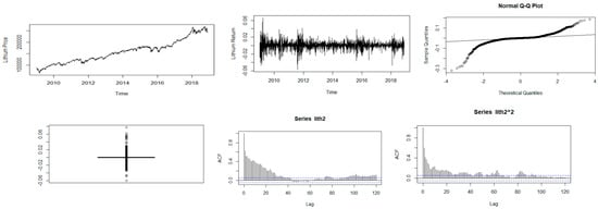 Descriptive plots: Top-left panel—Time series plot of the daily closing price; Top-middle panel—Time series plot of the daily returns Top-right panel—QQ plot of the daily returns; Bottom-left panel—Box plot of the returns; Bottom-middle panel—ACF plot of the returns; Bottom-right panel—ACF of the squared returns for lithium.