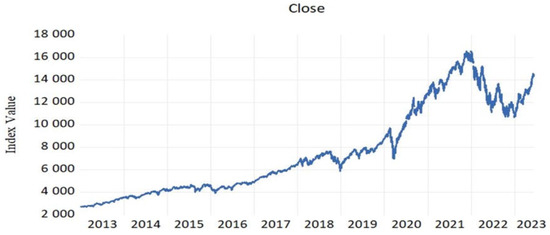 Index Value of NASDAQ (2013–2023). Source. https://www.nasdaq.com/market-activity/index/comp/historical (accessed on 15 February 2023).