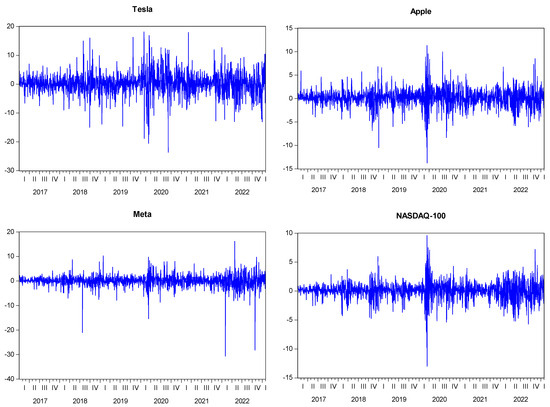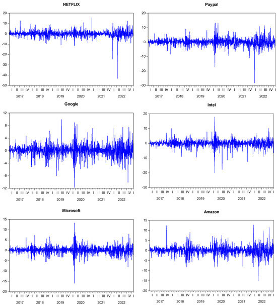 When examining the values of descriptive statistics in Table 2, particularly the skewness referred to as the third moment and kurtosis known as the fourth moment, it is demonstrated that financial asset returns possess a leptokurtic characteristic that does not support the assumption of normal distribution. This information is further supported by the Jarque–Bera statistics. As can be observed, every row’s standard deviation value is higher than the mean. These lines also have a high variation and volatility. Stated otherwise, the fact that the numbers derived from the division of the standard deviation by the mean exceed the coefficient of 1 indicates a significant level of volatility, particularly in financial data. Maximum and minimum values indicate the lowest and highest return values of the relevant variable. A median value indicates the median value of the series. According to the table, it is seen that the averages for all global variables are centered around zero, and there is a negative average only for Intel stock. It is noted that the series does not follow a normal distribution because the kurtosis values are significantly greater than the value of 3, which is thought to have a normal distribution. Furthermore, the left-negative skewness scenario with a long-left tail is identified by the fact that all variable skewness values have negative coefficients. Another finding that supports that the series is not suitable for normal distribution is that the Jarque–Bera statistics obtained through the formulation, considering the kurtosis and skewness values, take values far from zero and the series moves away from the normal distribution. Furthermore, the left-negative skewness scenario with a long-left tail is identified by the fact that all variable skewness values have negative coefficients. Additionally, the statistical significance of the probability values indicates the reliability of the values presented in Table 2. Figure 2 confirms that the differenced return series exhibits a stationary process over time, validating its suitability for our analysis.