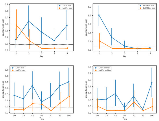 Let us plot the average test loss of LSTMs and LaSTMs as a function of at fixed , the dimension of the memory cell, and at fixed . This approach is taken by Rosenbaum and Zhang (2022), who trained 10 LSTMs instead of 20 here. Figure 1 shows that LaSTMs enjoy a sizeable advantage on average. We note that when , our initial intuition was correct: LaSTMs have a smaller average test loss for all variations of hyperparameters ( and bias).