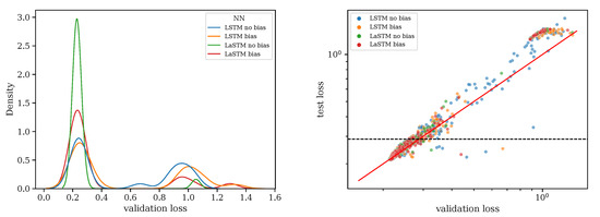 Convergence during the training process, it turns out, is a hit and miss process: some models are stuck in a high-loss regime, while some models do learn a more realistic dynamical process and achieve much lower losses. This yields a bi-modal density of losses (see Figure 2). It is noteworthy that the fraction of LaSTMs that learn better is much larger. This is linked to the fact that LaSTMs learn much faster (see below) and that LaSTMs without internal biases are less likely to be stuck in a high loss regime.
