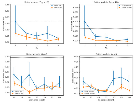 Table 1 reports the MSE of various model choices. LaSTMs are still better than LSTMs, even for larger . Figure 3 plots the average test loss of the models with a below-average validation loss versus and the sequence length. The test losses are now much closer, but LaSTMs still retain a sizeable advantage: their test losses are both lower on average and their fluctuations are much smaller.