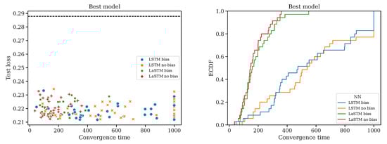 Finally, let us investigate the test loss of the model with the best validation loss among the 20 models trained for each of the 140 hyperparameters/architecture choices. It turns out that under these conditions, LaSTMs and LSTMs exhibit essentially the same performance. What differentiates them however is the speed at which they learn. Let us plot the test loss versus the time of convergence for LSTMs and LaSTMs with and without biases (left plot in Figure 5). There is slight negative dependence between test losses and convergence times; the longer one learns, the better. Notably, the convergence times of LSTMs are spread all over the whole interval, while LaSTMs converge before 400 epochs. The right plot in Figure 5 displays the ECDF of the convergence times, which shows a sizeable difference between LSTMs and LaSTMs: whereas 20% of LSTMs models do not manage to converge before 1000 epochs, all LaSTMs do before 400, except one, when biases are allowed.
