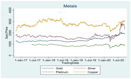 - Mensi, Walid, Mobeen Ur Rehman, and Xuan Vinh Vo. 2020. Spillovers and co-movements between precious metals and energy markets: Implications on portfolio management. Resources Policy 69: 101836. [Google Scholar] [CrossRef]