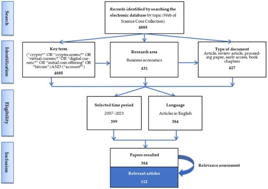 Secondly, in WoS (Figure 2), the search filters for this study were meticulously designed to target the available literature on cryptocurrency accounting within the business economics research area from different countries worldwide. As a result, out of 431 scientific papers, 47 were considered irrelevant and excluded according to the eligibility steps described in Figure 2. The scheme shows the selection of studies and the inclusion or exclusion criteria of papers at every stage. Therefore, based on the inclusion standards, the database included 384 suitable research papers.