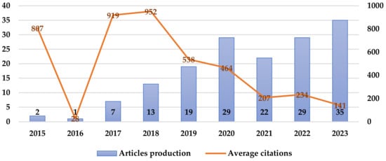 Considering the citations for the 157 articles, the trend, graphically represented in Figure 3 by the orange line, seems opposite to annual scientific productions, with 952 citations in 2018 but recording a continual decrease until 2023, when the total number of citations per year was 141 citations. According to the growth of publications, we expect the trend of citations to grow because publications released in recent years will be cited. This citation delay is especially found in rapidly evolving fields, such as technology, where newer research may supersede older more quickly.