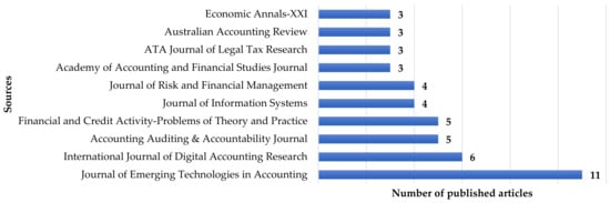 The sources are presented in increasing order: “Economic Annals-XXI”, “Australian Accounting Review”, “ATA Journal of Legal Tax Research”, and “Academy of Accounting and Financial Studies Journal” published three articles. Four papers were released through the “Journal of Risk and Financial Management”, and the “Journal of Information Systems”. Also, there are two journals with five articles published: “Financial and Credit Activity—Problems of Theory and Practice” and the “Accounting Auditing & Accountability Journal”. The “International Journal of Digital Accounting Research” published six articles, and the most significant source, with 11 publications, is the “Journal of Emerging Technologies in Accounting”.