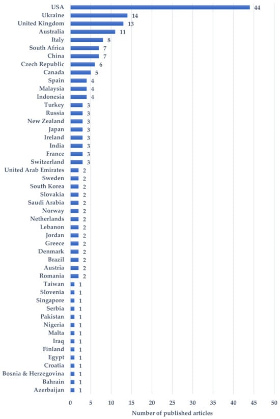 At the macro level, regarding the country’s scientific production of articles, the authors projected Figure 5 from Biblioshiny, which illustrates that the USA is the world leader in the research regarding CA, with 44 documents released, followed by Ukraine with 14 articles. With 13 manuscripts in the United Kingdom and 11 articles in Australia, a growing interest in CA is indicated. China and South Africa released seven research papers. Italy released eight documents; the Czech Republic recorded six articles; Canada has five articles; and Spain, Malaysia, and Indonesia have four manuscripts on CA. Finally, there are countries with fewer articles published: Turkey, Russia, New Zealand, Japan, Ireland, India, France, and Switzerland (three articles).