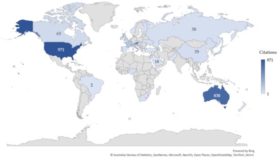 Observing Figure 6 and Table 1, it can be easily seen that the USA is paramount when exploring CA, with 971 citations of scientific scripts. The following countries are Australia, with 830 citations, and Austria with 696 citations. Italy and France rank highly in the top five, with 269 and 219 citations, respectively. The authors generated a Miller map projection within MS Excel to visualize these findings, with data retrieved from Biblioshiny. This map presents the most cited countries in CA (Figure 6).