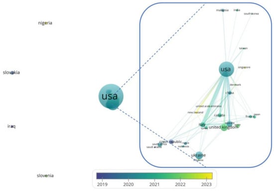 - The third cluster shows the interconnection between China (four manuscripts, 34 total link power), Singapore (one document, 2 total link power), and Taiwan (one item, 4 total link power), and it added its contribution recently, between 2021 and 2023.