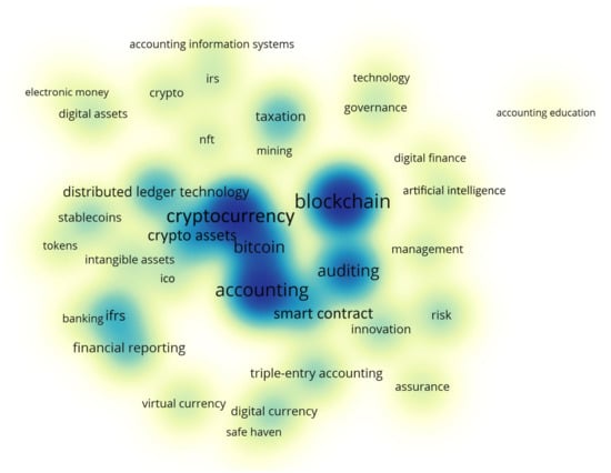 Therefore, the bibliometric analysis of cryptocurrency accounting consists of identifying and analyzing academic research articles, papers, and other scholarly publications that explore the intersection of cryptocurrency and accounting. The dataset for this study was obtained by combining the Web of Science Core Collection (WoS) database with the Scopus database. WoS is a precious tool allowing researchers, scientists, and scholars to search for literature, analyze citations, and monitor research impact. Scopus is an extensive, multidisciplinary database of abstracts and citations launched by Elsevier. Moreover, a combination of software tools was employed: VOSviewer 1.6.20 () for visualization and network analysis, together with Biblioshiny (Bibliometrix) () from RStudio for data manipulation and exploration, and Microsoft (MS) Excel for basic graphs and world maps. VOSviewer generates three distinct kinds of bibliometric maps, which include cluster visualization, “overlay visualization”, and “density visualization” (). Biblioshiny is an instrument that uses data from bibliographic databases to perform bibliometric analysis or portray dynamic maps and graphs. Nonetheless, with MS Excel, we studied the most relevant sources and generated different figures and maps.