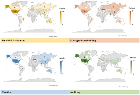 The empirical results of the bibliometric study are based on the outputs of VOSviewer, Biblioshiny, and Microsoft Excel. The graphics from Section 4.1 were employed to identify and illustrate the co-occurrence of the authors’ keywords in their publications. Grouping the keywords into clusters results in four core accounting-focused areas: financial, managerial, tax, and auditing. Therefore, starting from Section 4.2, the thematic analysis, based on the mentioned areas, reveals the geographical regions of the research setting, providing a detailed summary of the present state of understanding of CA. Finally, Section 4.3 provides key discussions and diverse perspectives on the researched subject.