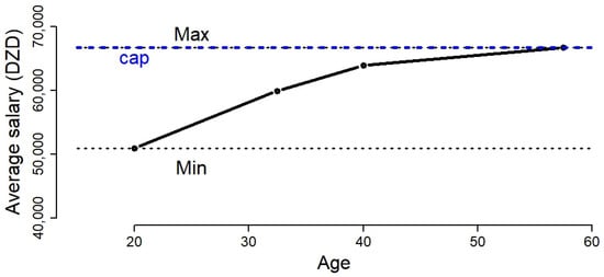Due to a lack of data about salaries, the distribution of wages is not made available in official statistics or in academic publications. What we do have is the evolution of salaries by large age intervals. In order to set up an easily understandable framework for our calculations, we assume all workers aged in year receive the same wage; the latter is assumed to grow with time and age. Setting age 20 to be the age of first entrance to the labor market in the year (t), an average worker is expected to receive a salary of , which corresponds to the minimum salary an average worker could receive during their entire working career. We assume, implicitly, an increasing salary evolution during a working career. Thus, the maximum wage is received during the last year before retirement. The range of salary evolution corresponds to the gap between early and late working career salary.
