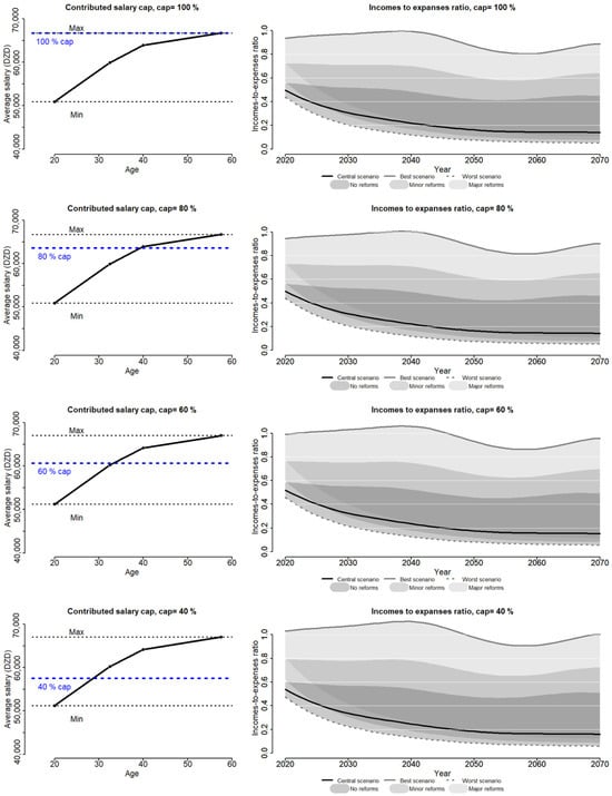 The proposed methodology allowed us to assess the effectiveness of the contribution cap as a supplement to traditional parametric adjustments in improving the long-term sustainability of Algeria’s pension plan in a changing socioeconomic environment. It also allowed us to assess whether a contribution cap may be used to substitute or supplement parametric reforms as a solution to population aging implications. The benefit of crossing multiple caps with multiple reform actions, all paired with multiple environmental scenarios, is that it allows for the assessment of sustainability conditions and the determination of whether a specific contribution cap level will help to ensure the system’s future sustainability, as well as the combination of parametric reforms and socioeconomic conditions.