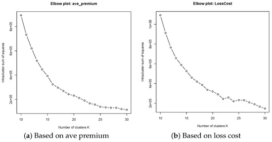 The hierarchical clustering method we have utilized in this study treats the number of clusters as a quantity to be determined before the algorithm proceeds. Some guidance is offered in Chavent et al. (2018): “According to the dendrogram, the user can select an appropriate number of clusters K with their favorite rule”. We have opted to set (K = 15) for this study, which is justified by an application of the elbow method. This result was reported in Figure 1. Hierarchical clustering fixes K throughout the study; therefore, the K represents regular behaviour of risk territories in Ontario. For purposes of evaluating the impact of the pandemic, it is sufficient to consider data before 2020—i.e., data that reflects pre-pandemic behaviour. For each of the four loss metrics—loss cost, claim severity, claim frequency, average premium—we collected the dendrograms used to create reference clusters. Due to the complexity of the data, it is not feasible to suggest a value for K by inspecting the dendrograms. We instead use the elbow method; creating the corresponding elbow plot for every loss metric confirms that () is an appropriate choice for the study.